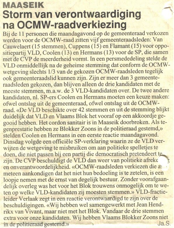 Insgelijks voor wat betreft de politieraad. Ook daar werd Mat in 2000 onze eerste mandataris. En, de eerste die het cordon brak. Wat zeggen we nu? De eerste die het cordon brak? In de tijd dat de dieren nog spraken? Jawel beste lezers. Want Mat kreeg stemmen vanuit andere partijen om dat mandaat te bemachtigen. Schande sprak men ervan ter linkerzijde. “Storm van verontwaardiging” kopte Het Belang van Limburg. De socialisten briesten van woede naar VLD dat zij de duivels waren die “blokker Zoons in de politieraad gestemd hadden”. Toenmalig VLD kopstuk Verlaak gebaarde van krommenhaas. De arme man had een acute aanval van politiek geheugenverlies en wist van niets. Wij en ‘Blokker Zoons’, wij wisten beter.
